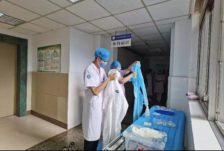 近期国内疫情形势依然严峻,为进一步规范医务人员行为,增强全院职工疫情防控的意识,7月21日下午,医务处、护理部、院感科联合进行了疑似新冠患者应急处置演练。此次演练在外科病区举行,全科医务人员制定了详尽的演练方案,人员分工明确,反应迅速,报告及时,处置规范,应对有效,无论是从物品准备到情景演绎,都体现了参与者们的认真严谨,配合默契。